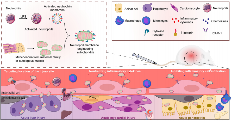 该项研究通过将线粒体与中性粒细胞膜融合,开发了一种新型的免疫工程化线粒体(nMITO)。这种nMITO结合了中性粒细胞膜蛋白的损伤靶向和抗炎特性以及线粒体的细胞修复功能。研究发现,nMITO能够有效阻断炎症级联反应,恢复线粒体功能,并通过隧道纳米管(TNTs)将线粒体传递到受损组织细胞中,从而增强其对炎症和细胞损伤的调节效果。