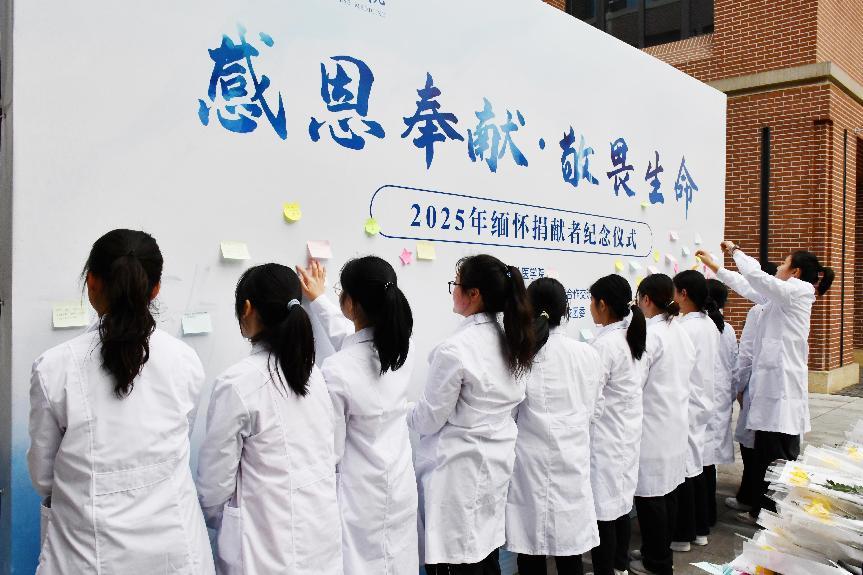 “感恩你们的奉献,我相信祖国正是因为像你们这样的无私奉献者而更加繁荣。”“愿我的成长不负您赠予的永恒的一课。”“超越死亡,超越时间,有缘与您相见,感谢无言,您教会了我很多。”……同学们把自己想对捐献者们讲述的话语写在一张张心愿贴纸上,粘贴在纪念墙上。