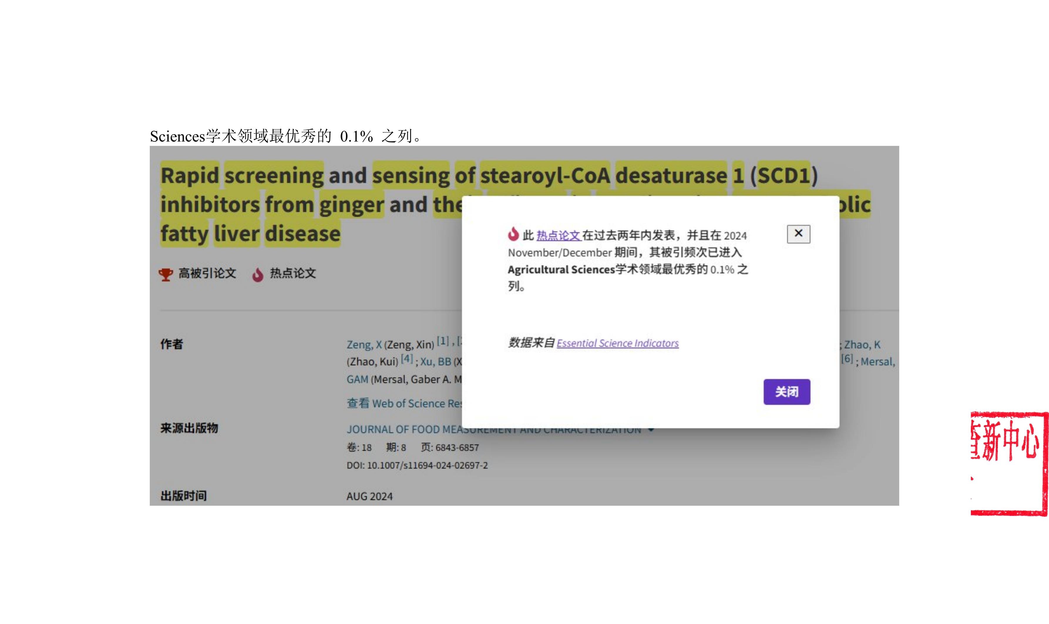 近日,米兰官网中医药防治代谢性疾病传承创新团队前期发表的题为“Rapid screening and sensing of stearoyl-CoA desaturase 1 (SCD1) inhibitors from ginger and their efficacy in ameliorating non-alcoholic fatty liver disease”(《姜中SCD1抑制剂的快速筛选及其改善非酒精性脂肪肝的作用》)的SCI论文,同时入选农业科学领域ESI热点论文和ESI高被引论文。该项研究通过快速筛选手段发现了姜中潜在的SCD1抑制剂(6-姜酚、8-姜酚及10-姜酚),并首次揭示了10-姜酚具有改善非酒精性脂肪肝的作用。