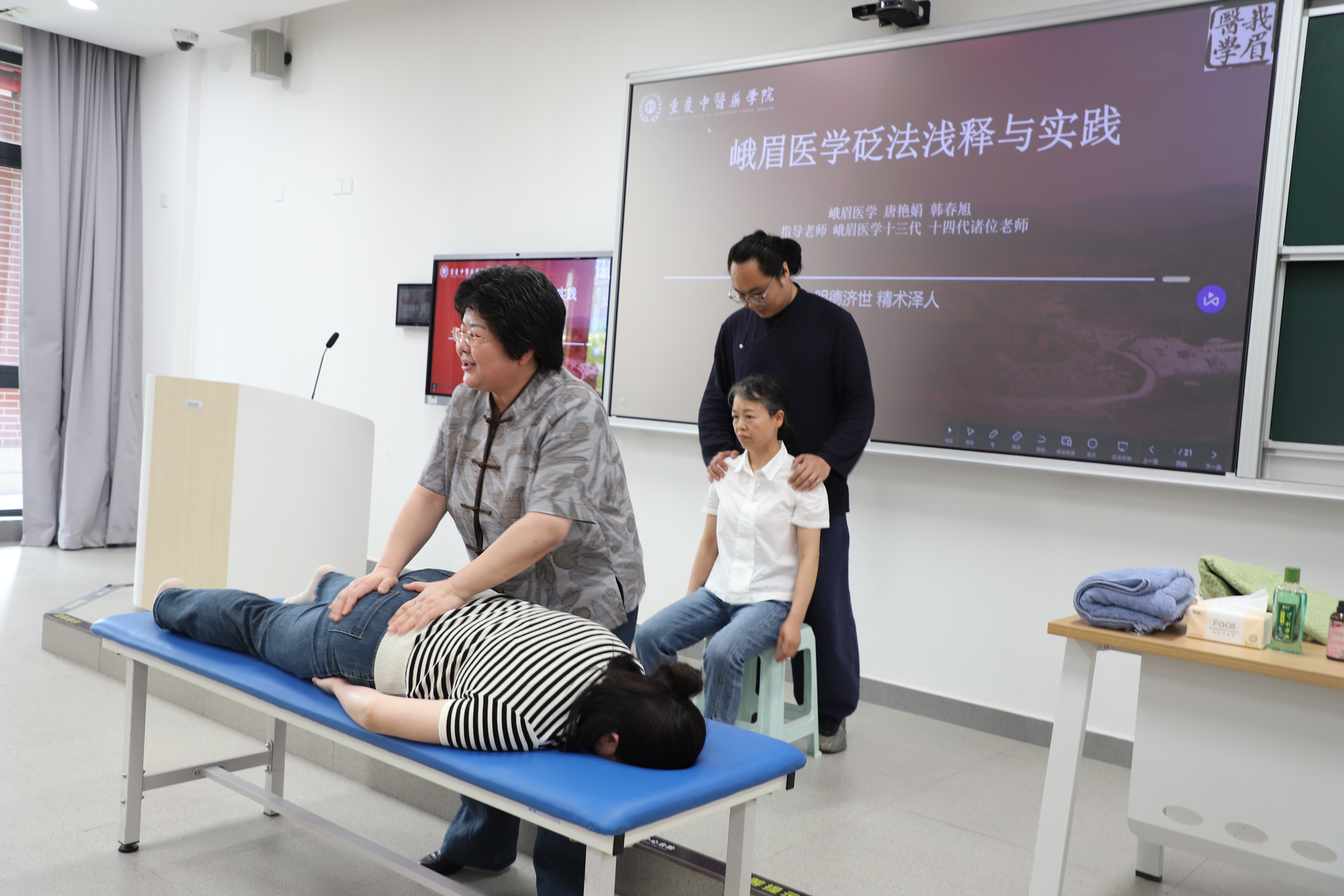 其中,峨眉医派专家现场展示介绍的“峨眉医学砭法实践”吸引了现场嘉宾的眼球。砭法作为中医外治法的重要组成,在峨眉医派800余年的传承中形成了独特体系。专家现场演示了如何运用特制砭石,结合二十部正奇经道分经理论,开展精准调理。这种源自汉唐的古法技艺,不仅具有显著的临床效果,更蕴含着“天人合一”的养生智慧,在现代健康管理中得到了很好地创新应用。
