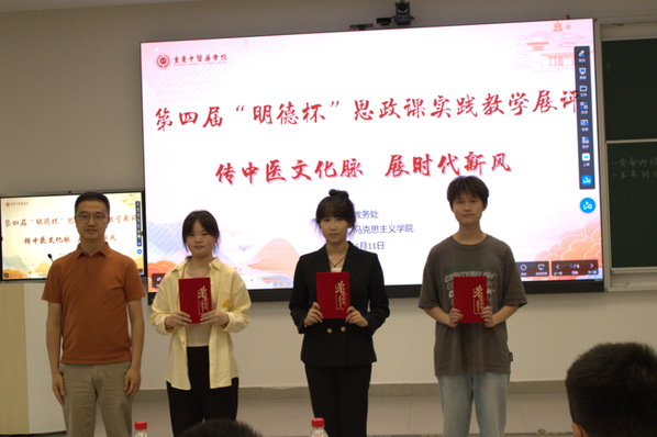 马克思主义学院院长代浩云在活动致辞中表示,一直以来“明德杯”活动始终坚持弘扬中医药文化自信的主旋律,目前已举办到第四届,实践教学形式不断优化、内容越发充实、内涵逐渐深厚。未来,马克思主义学院将不断深化实践教学改革,推动理论与实践有机结合,合力培养高素质应用型中医药人才。